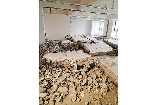 4.拆除楼板:不得损坏或加固楼板,以确保后续施工的安全。混凝土楼板拆除分离后,碾压到原来的位置,保证拆除不会损坏结构的周边部分。