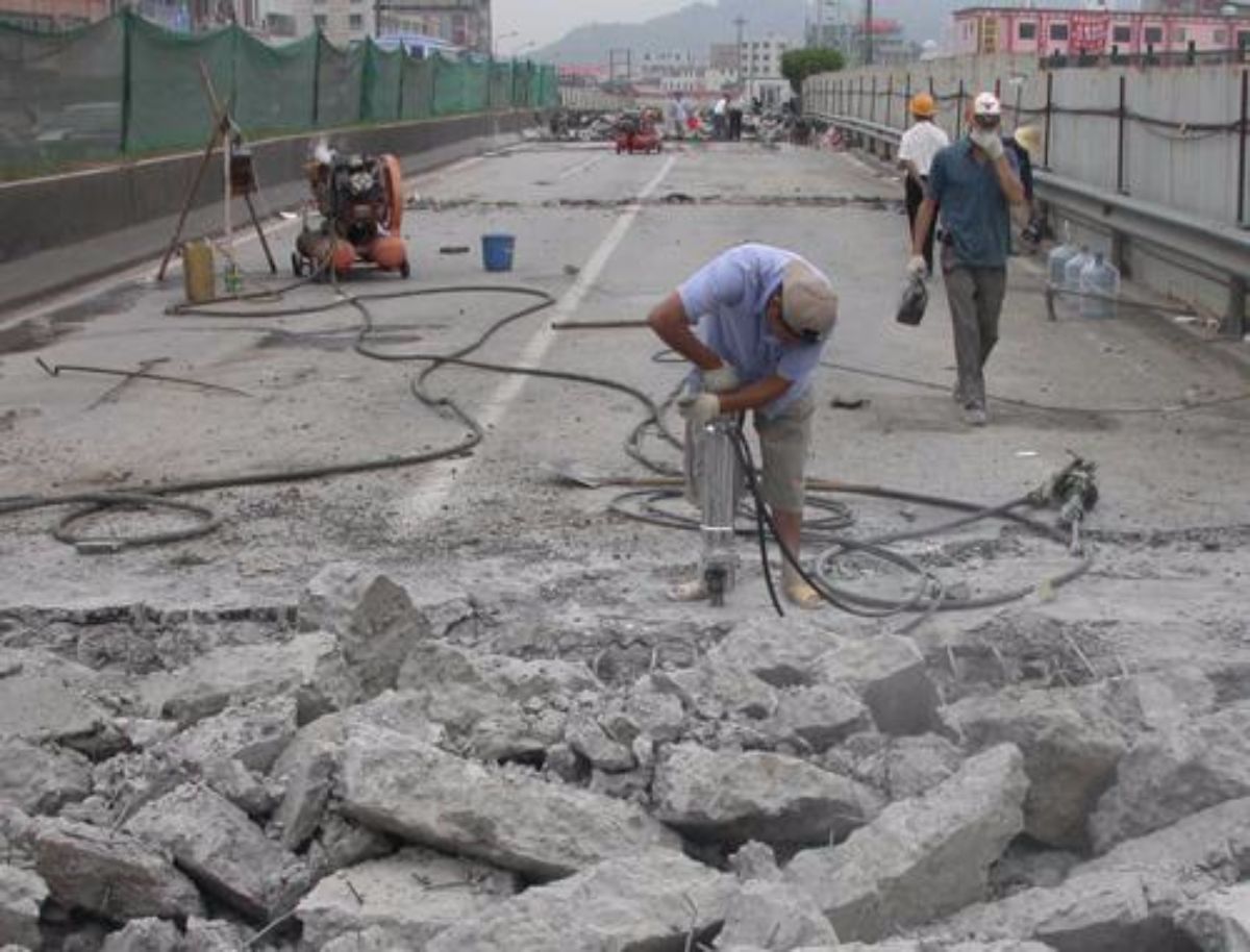 1、静态爆破拆除:静态破碎也称静态爆破。粉碎剂→风镐凿;用气枪在支撑梁表面凿开,切断箍筋,然后在梁上钻孔,设置膨胀剂,反应后膨胀迫使梁体开裂,然后用空气枪进行凿破,然后清理。优点是没有限制,比较安全,清洗简单,成本适中;缺点是施工速度慢,需要大量施工人员。