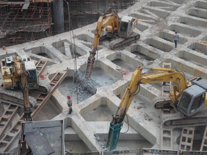 2、切割和拆除:支撑支撑梁,用切割方法(使用线锯设备或圆盘锯设备)将梁体切割成碎片,用吊车将其吊到基坑边缘进行破碎或运输到指定地点 用于破碎和回收钢筋。使用切割和拆除的**限制是可以在基坑周围放置大型起重机。优点是施工速度很快,项目使用比较赶,可以放置大型起重机成本比较低;不能现场堆放、破碎,成本会增加。