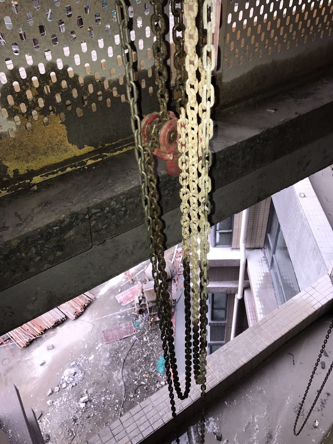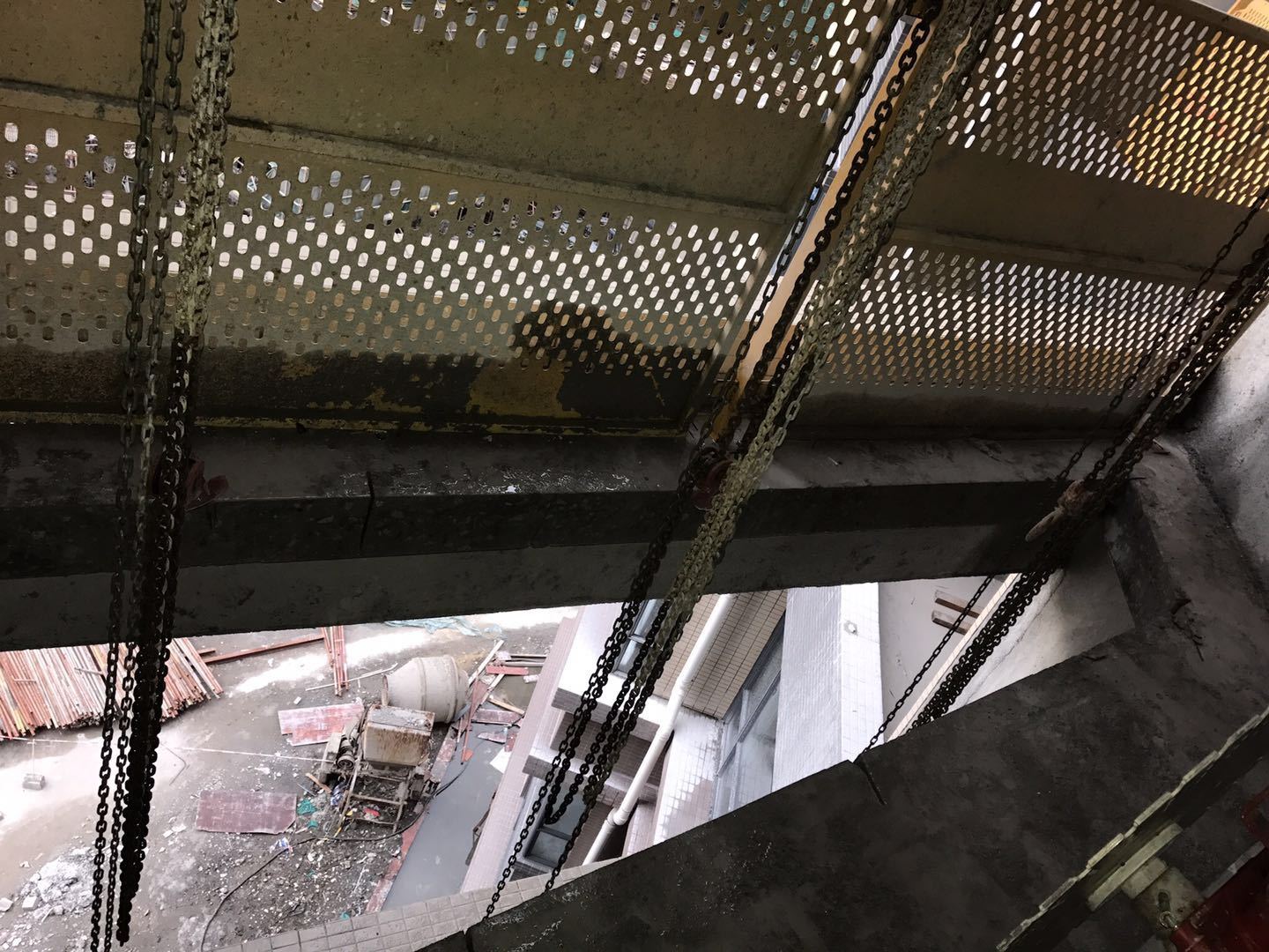 (7)、切割完后采用2个手拉葫芦将切割好的楼板吊装轻放至下层楼面或地面。