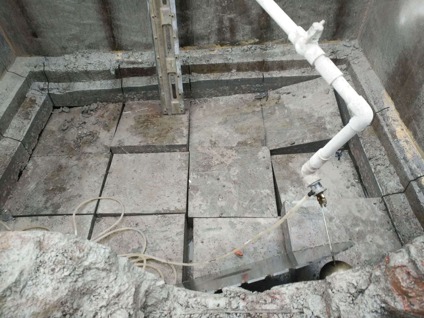 2.根据设计图纸要求,确定切割位置和大小,在混凝土表面用标记弹出切割的线条,确定先手顺序,再根据起吊设备情况确定楼板分块尺寸,为1.7m×1.57左右。