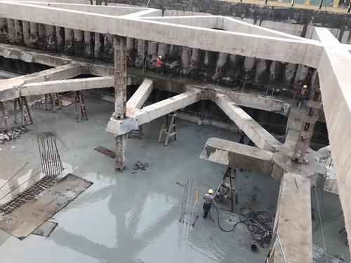 基坑深度深,需要凿除五道内的支撑。在基坑支撑拆除过程中,整个基坑的应力平衡通过三种支撑结构支撑到地块结构上。拆除支撑顺序选择、渣土运输及成品保护。施工过程安全管理。